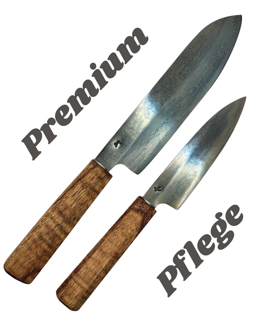 Von Hand reinigen, sofort trockenwischen, gelegentlich leicht ölen und auf Holz-/Kunststoffbrettern schneiden. Trocken und sicher lagern (Leiste, Scheide, Block).